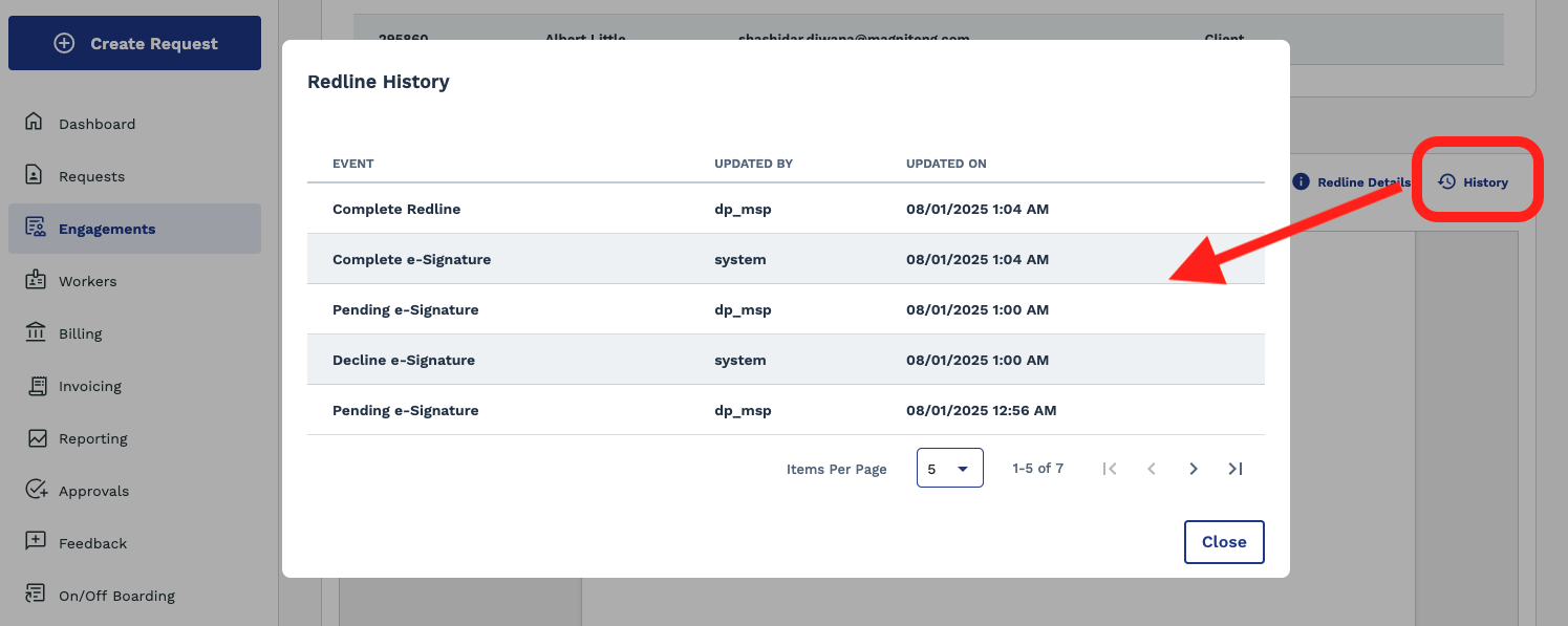 The redlining feature preserves activity from the redlining process. You can access the history by navigating to the engagement's SOW Document tab, scrolling to the content, and then aliening History.