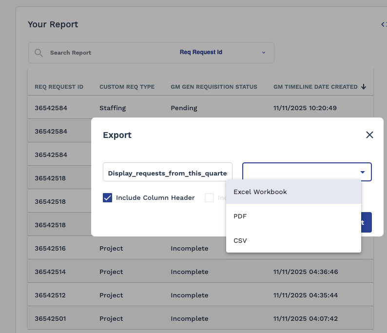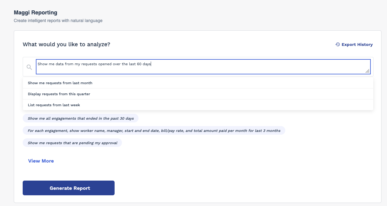The Reporting agent features a prompt field that allows you to enter a description of, for example, a report for the last 60 days of request date, or a list of workers hired in the last 30 days. The agent suggests queries that you can use to refine your prompt. Clicking a suggested prompt inserts it into the prompt field.