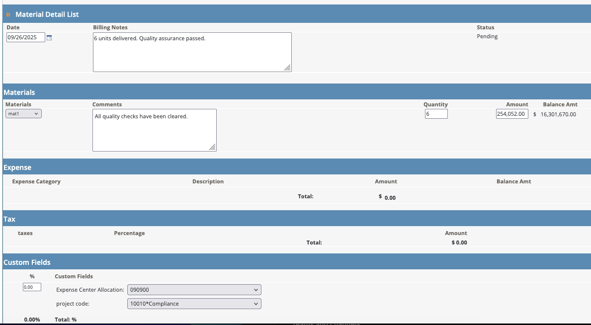 In the detail list, configure your milestones, materials, or position billing