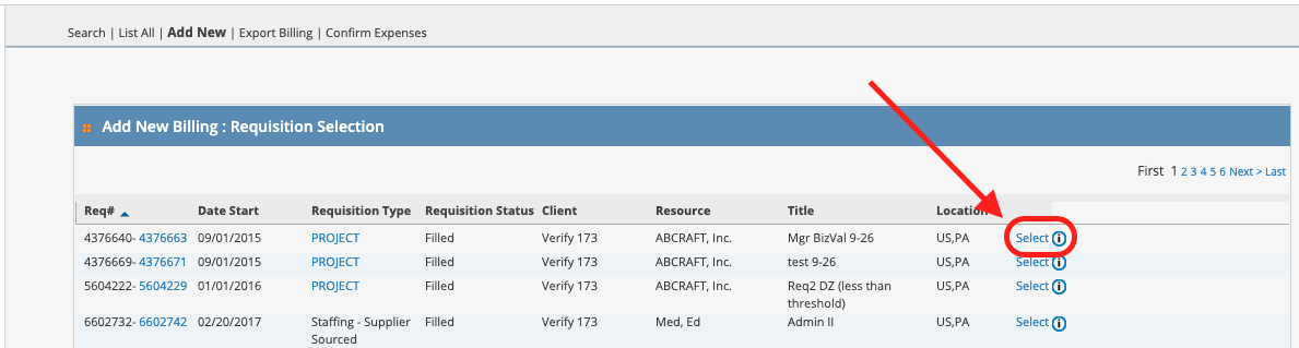In the Add New Billing : Requisition Selection, locate